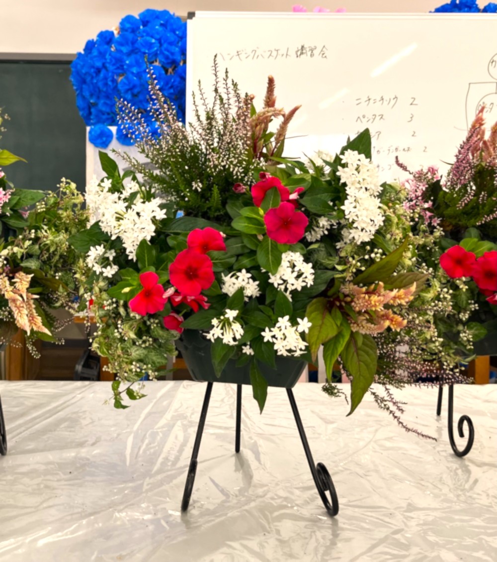 日本ハンギングバスケット協会神奈川支部の会員が、スタンディング型ハンギングバスケットを